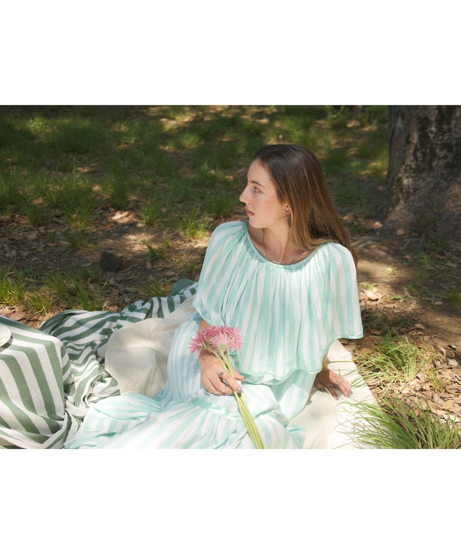 肩部分の大きなラッフルやフレア感が可愛い印象ですが、ロング丈とストライプが大人の印象に。